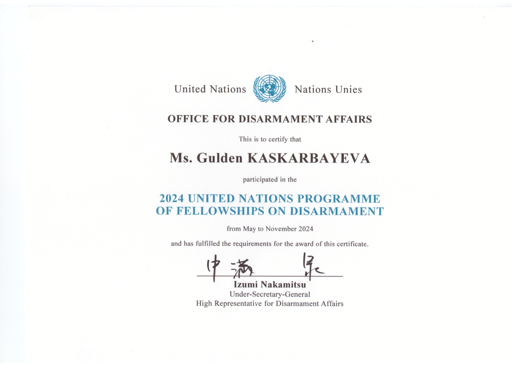 2024 жылдың мамыр-қараша айлары аралығында ССЗИ сарапшысы Гүлден Қасқарбаева БҰҰ-ның Қарусыздану мәселелері жөніндегі басқармасы ұйымдастырған БҰҰ жыл сайынғы стипендия бағдарламасына қатысты.