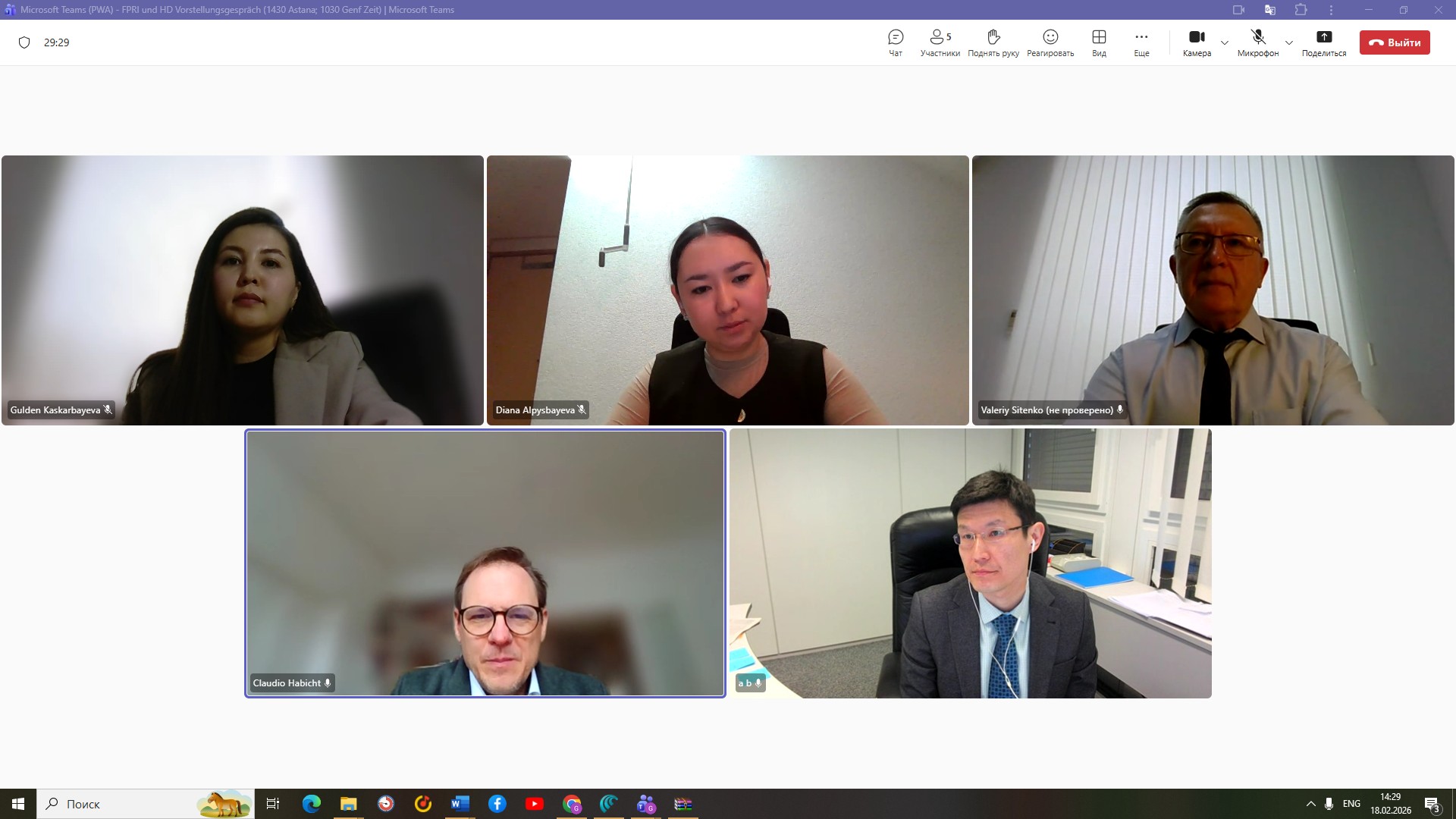2026 жылғы 18 ақпанда ССЗИ сарапшылары Валерий Ситенко мен Гүлден Қасқарбаева онлайн форматта Швейцариялық Гуманитарлық диалог орталығының (HD) Еуразия бойынша өңірлік директордың орынбасары Клаудио Хабихтпен және HD қызметкері Диана Алпысбаевамен кездесу өткізді.