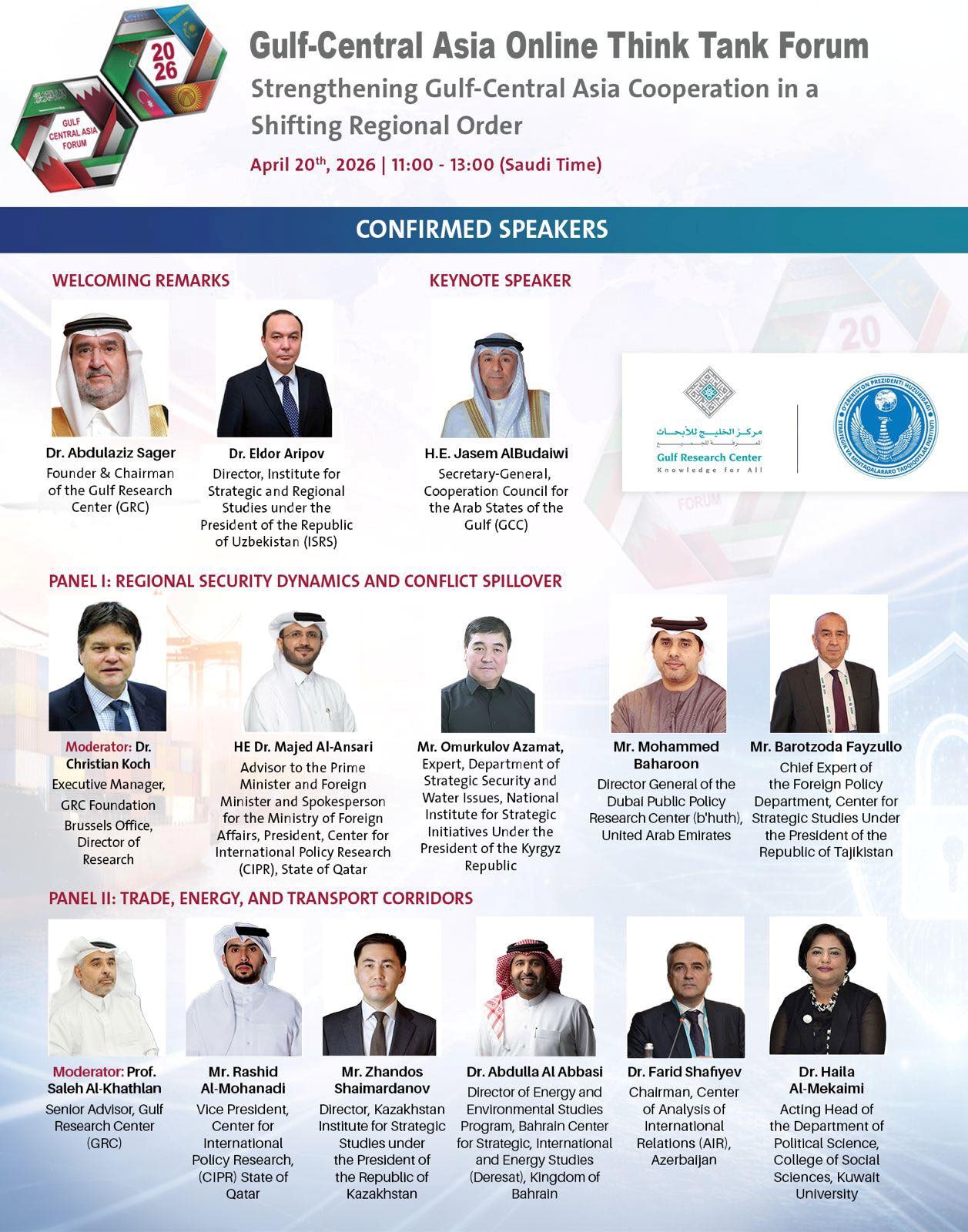 Пікірталастар барысында Парсы шығанағы араб мемлекеттері ынтымақтастық кеңесі мен Орталық Азия арасындағы өзара іс-қимылдың негізгі бағыттары, оның ішінде сауда-экономикалық байланыстарды кеңейту, инвестициялық ынтымақтастықты дамыту, сондай-ақ аналитикалық орталықтар арасындағы әрекеттесуді нығайту мәселелері талқыланды. Сонымен қатар энергетикалық және теңіз қауіпсіздігі мәселелеріне, оның ішінде Ормуз бұғазының жаһандық энергетикалық нарықтар үшін маңызына, сондай-ақ өңірлік тұрақсыздықтың жеткізу тізбектерінің орнықтылығына әсеріне ерекше назар аударылды.