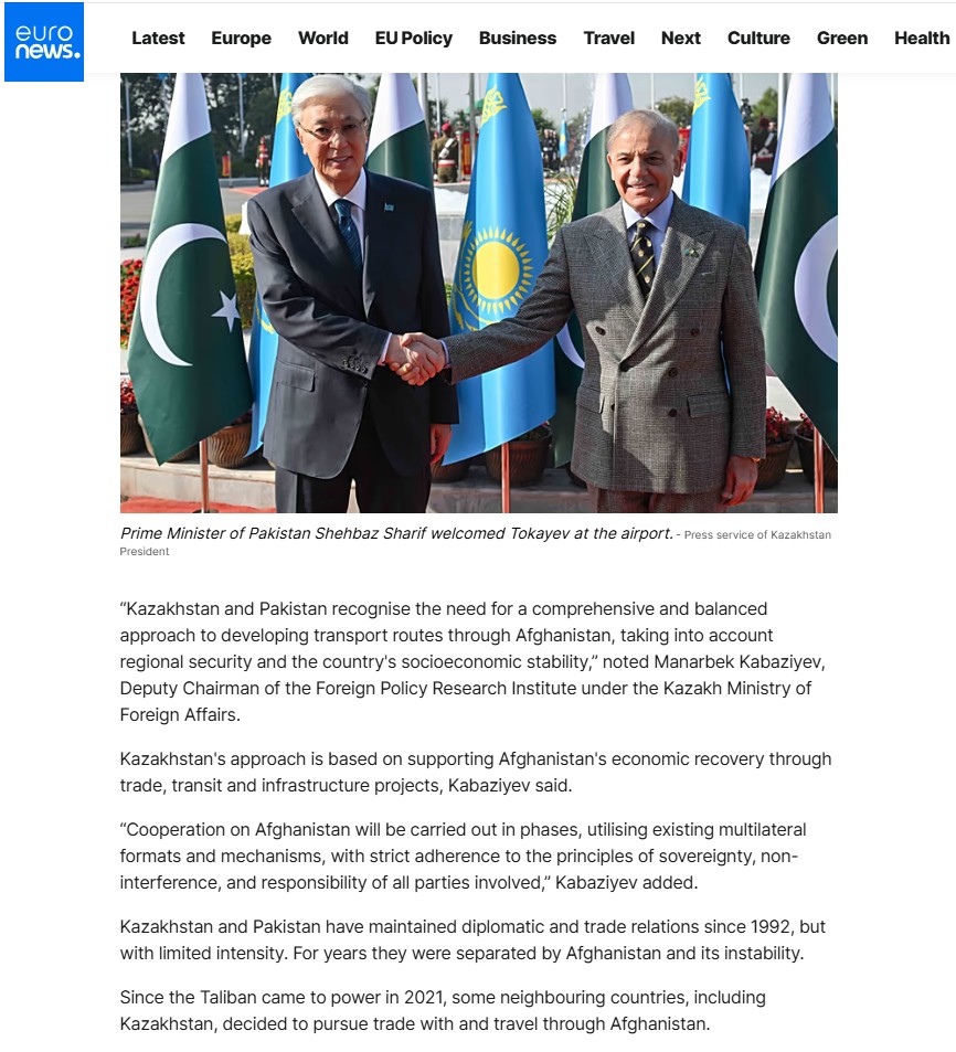 На сайте информационного агентства «Euronews» от 6 февраля 2026 года опубликована статья на английском языке, приуроченная государственному визиту Президента Республики Казахстан К.К.Токаева в Пакистан, с комментариями Заместителя Председателя Правления Института внешнеполитических исследований Манарбека Кабазиева по поводу современного состояния и перспективных направлений развития казахстанско-пакистанских отношений.
