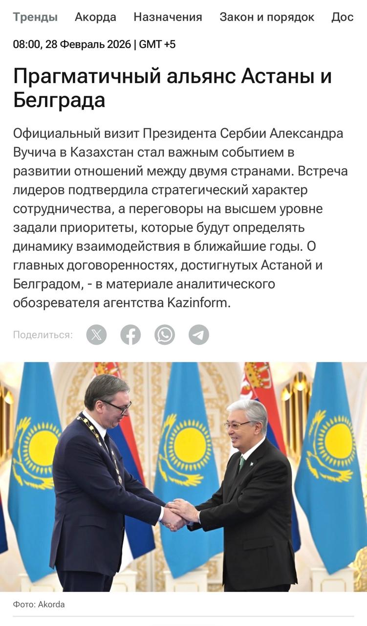 28 февраля 2026 года на сайте международного информационного агентства «Казинформ» опубликована статья под заголовком «Прагматичный альянс Астаны и Белграда», посвящённая итогам официального визита Президента Сербии Александра Вучича в Казахстан.